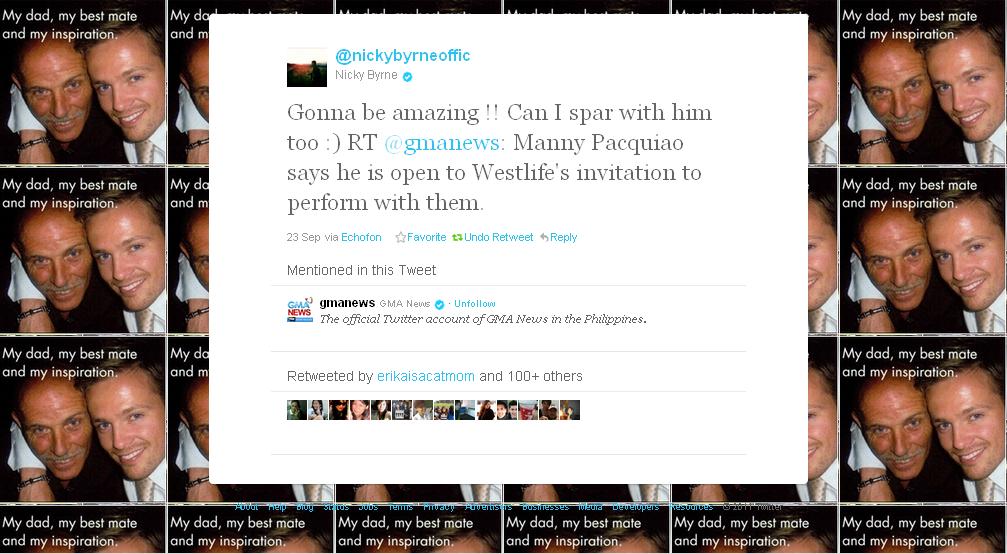 What do you think Westlifers? Will there be a Westlife-Pacquiao duet on September 29th, or will there be a sparring session between Nicky and Manny? Which idea is better?
