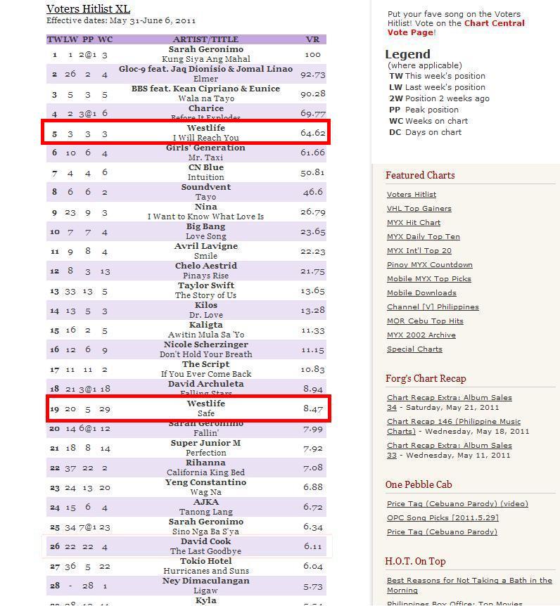 Westlife's "I Will Reach You" stumbles down this week to number 5. No reason to panic since it's only two places down from its position last week.